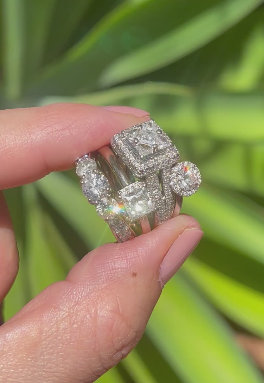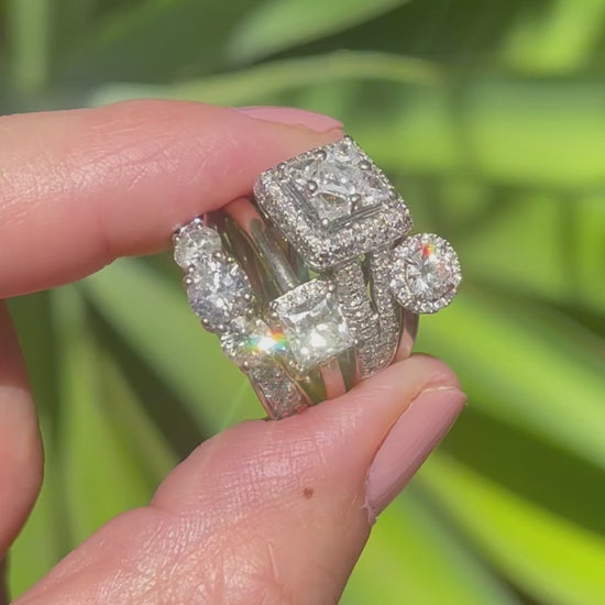 This ring is set in 18ct white gold with 3 different shapes / cuts of diamonds in total of 1.7ct. Engagement ring style .