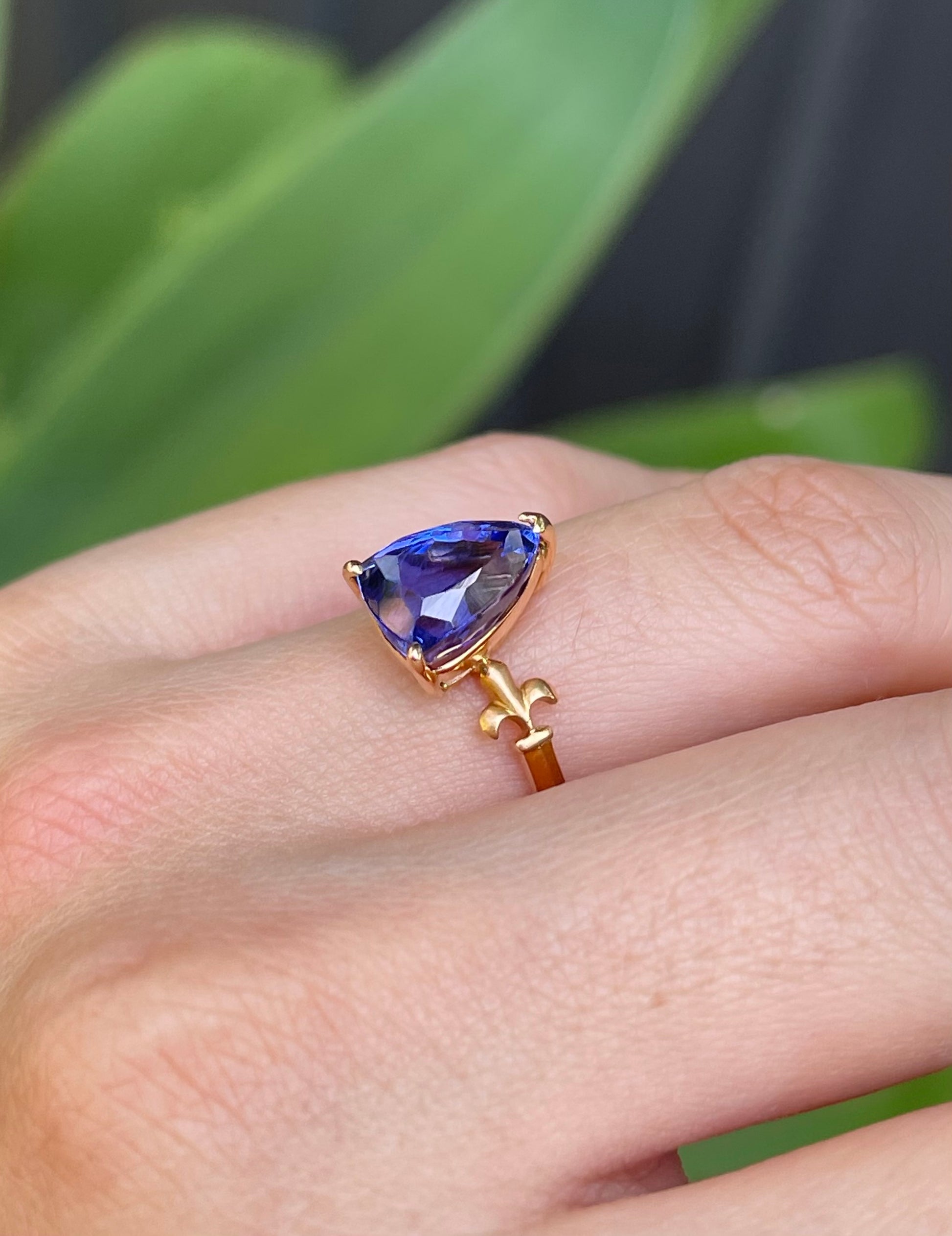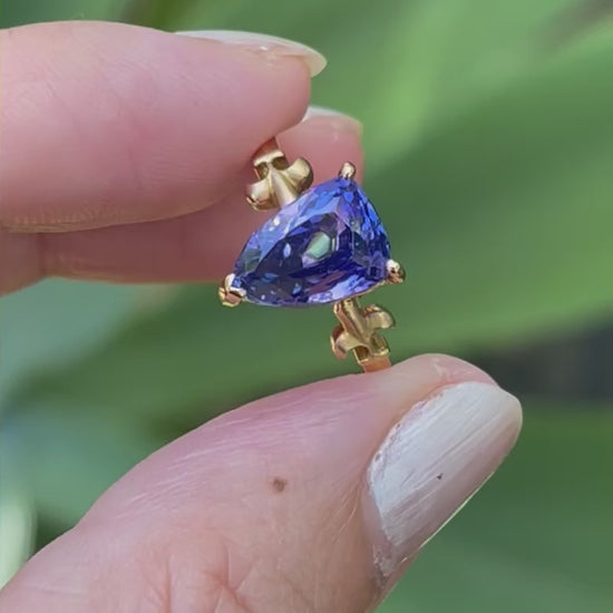 A stunning rare 4.1ct natural tanzanite from Tanzania with vivid blue-violet color, beautifully cut in a pear/trillion shape and set in solid 18ct gold. Exceptional sparkle and pleochroism — shifts from blue to violet depending on the light.
