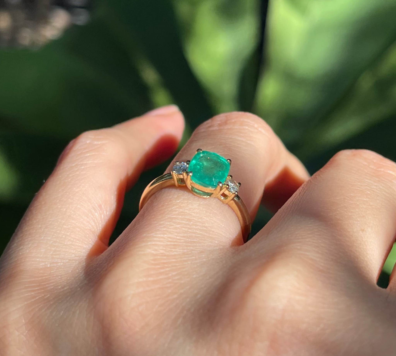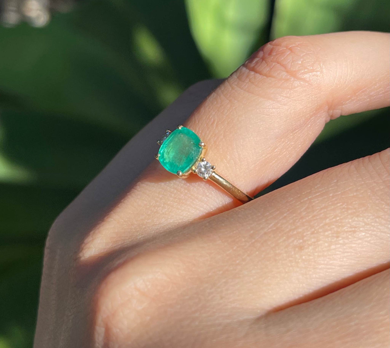 9ct yellow gold 1.5ct natural emerald with diamond 3 stone trilogy ring