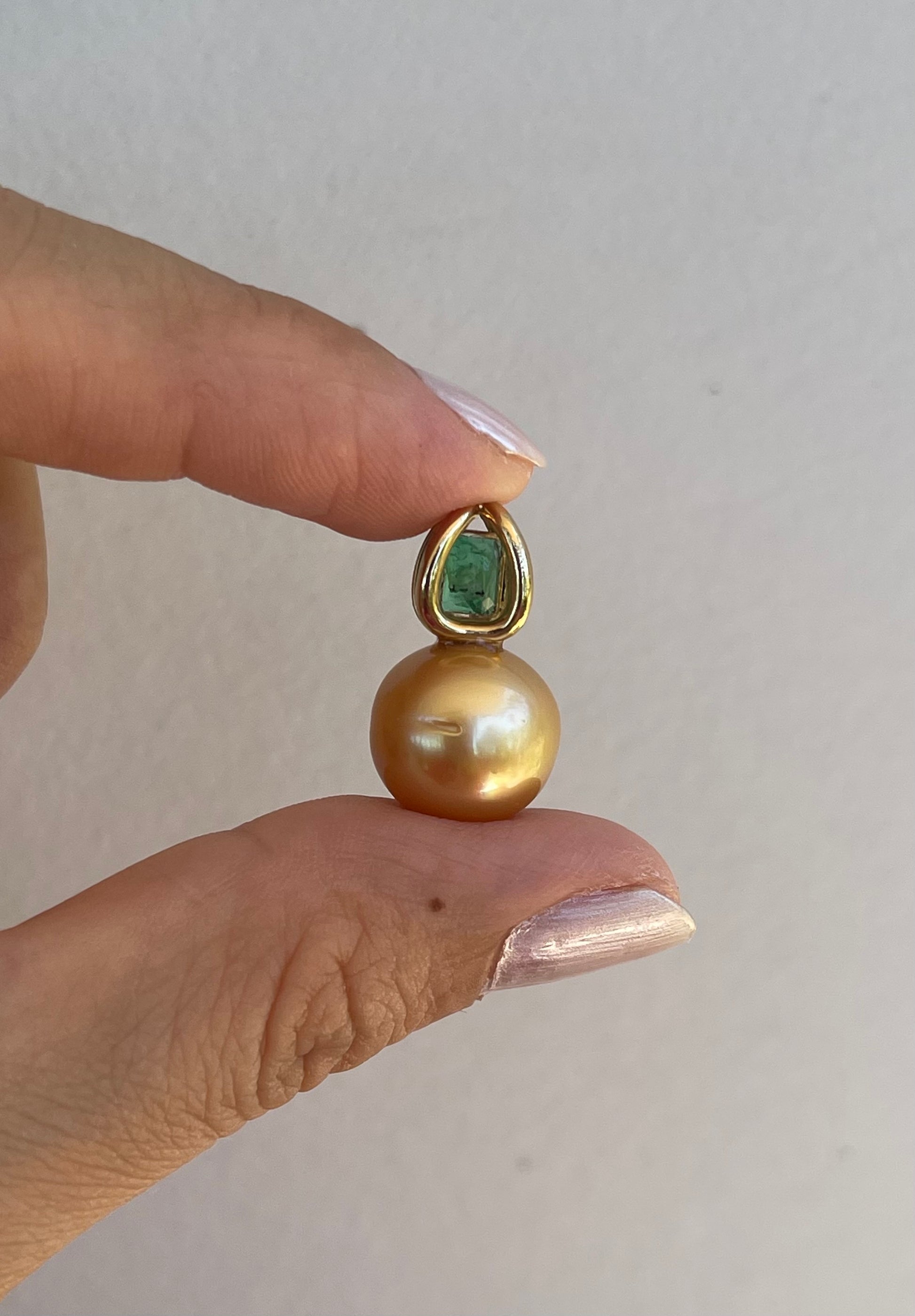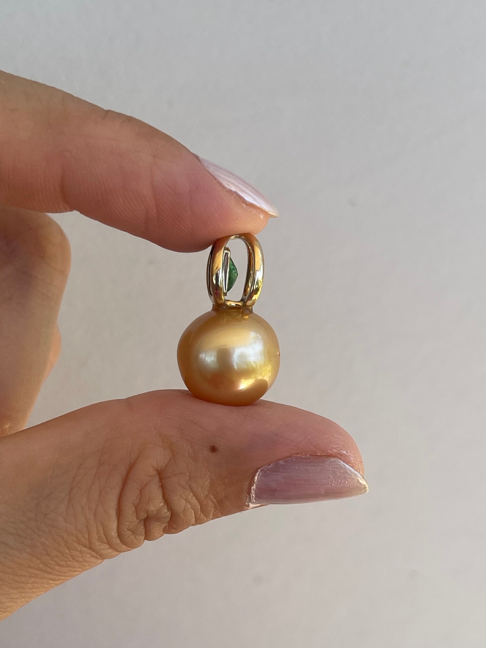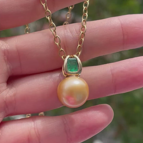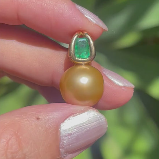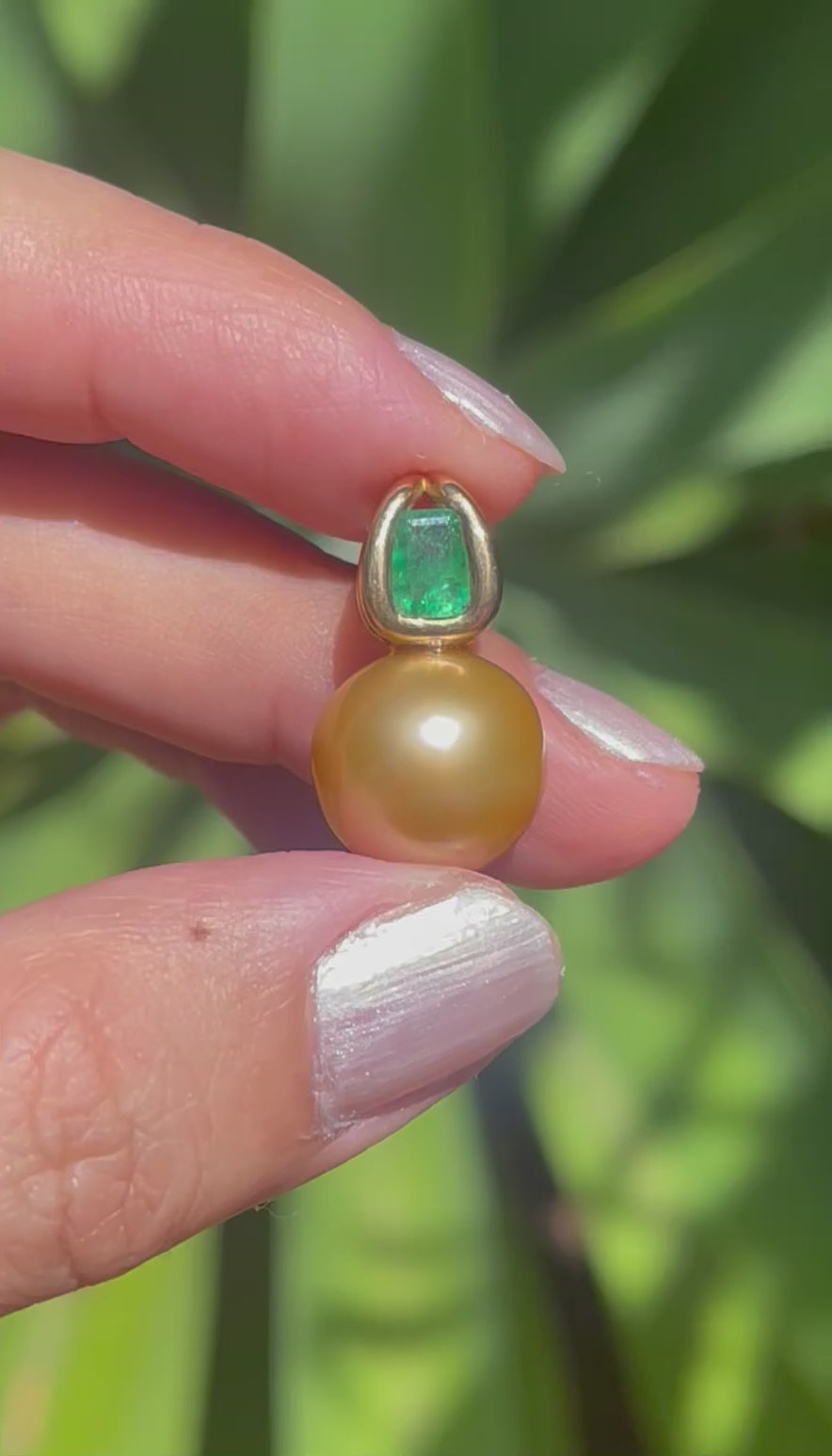 This exquisite pendant captures the poetry of nature itself — where the golden glow of the South Sea pearl meets the deep, untamed green of a natural emerald. Each piece tells a story of harmony between sea and soil, radiance and mystery, light and life.