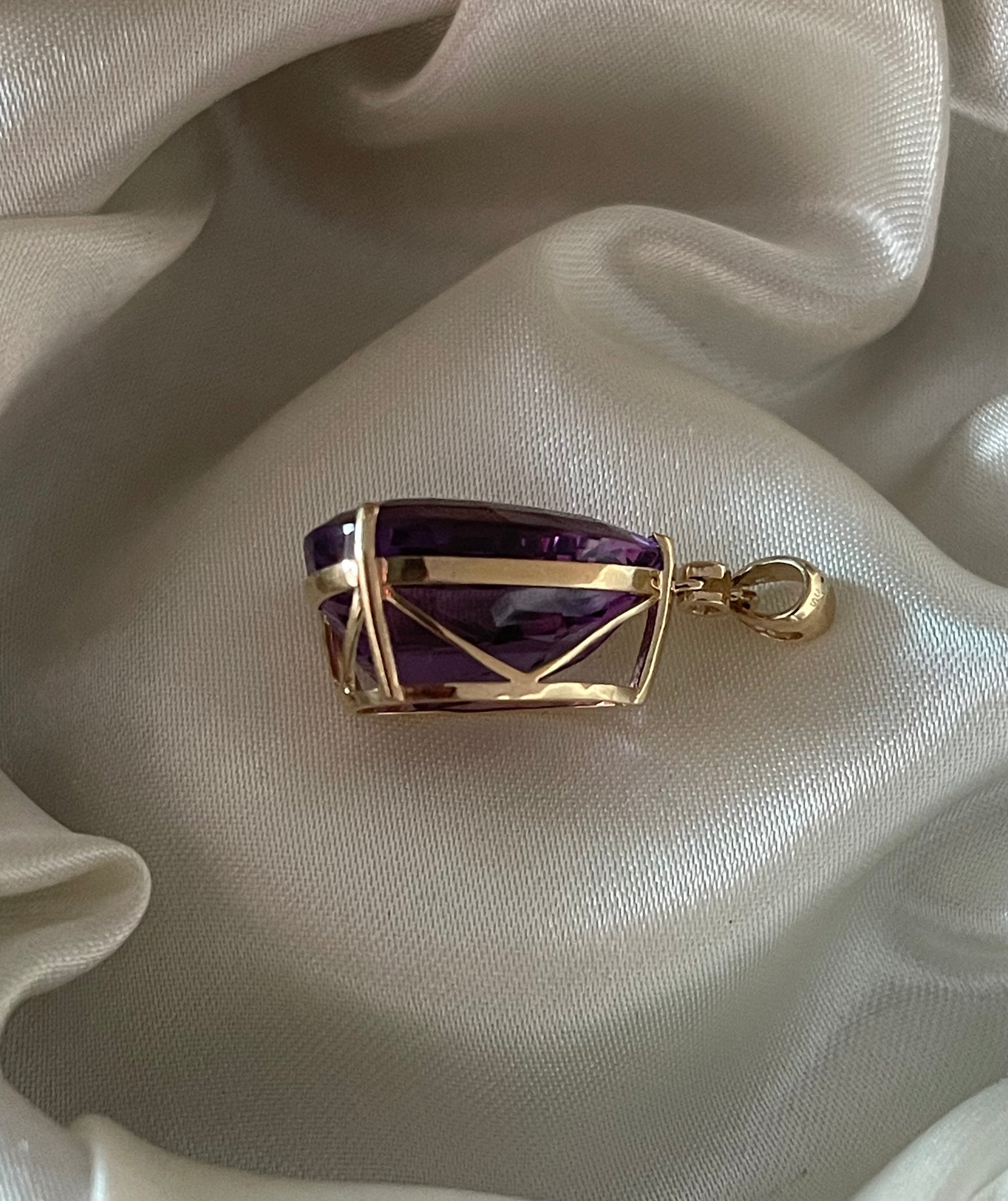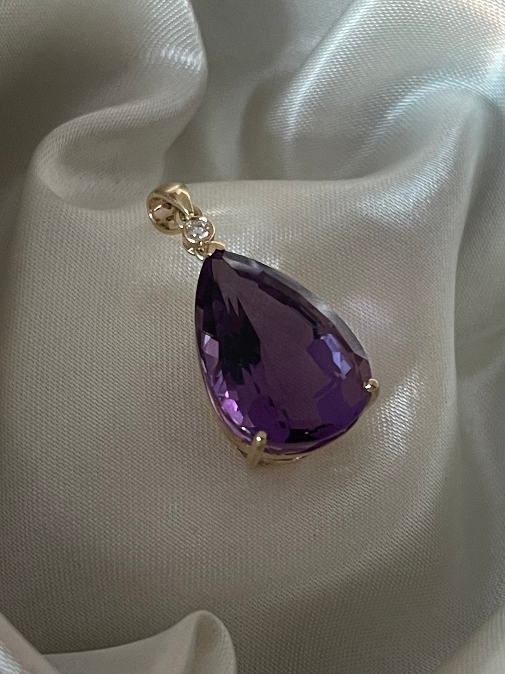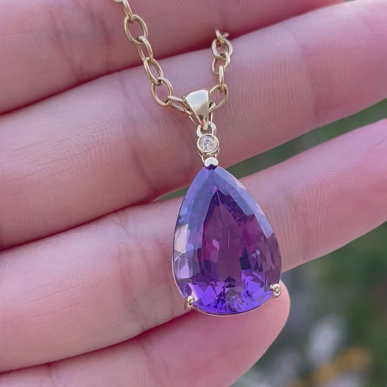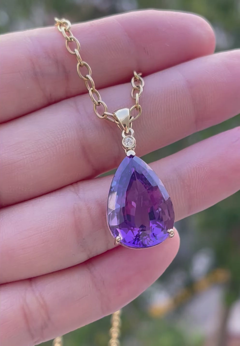 9ct yellow gold large pear shape 15.57ct natural deep purple amethyst pendant with diamond