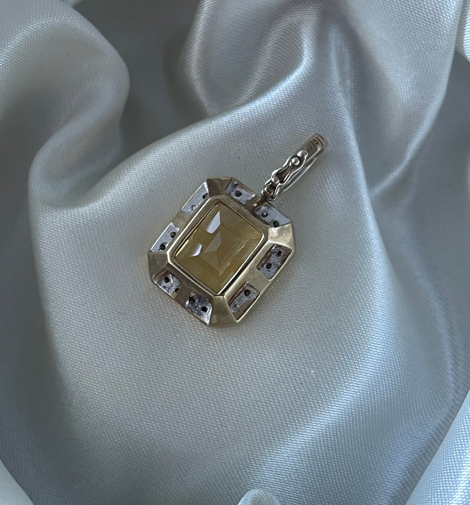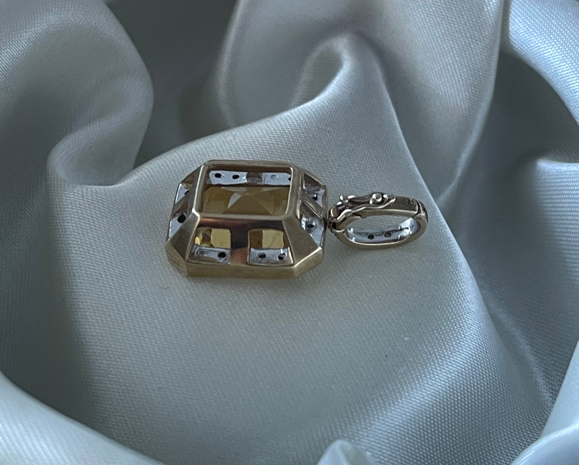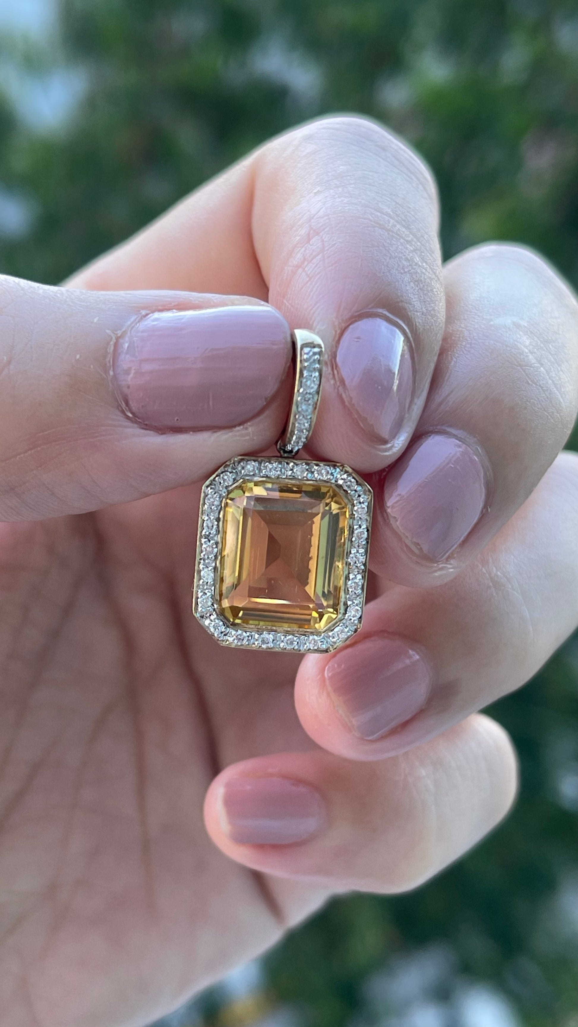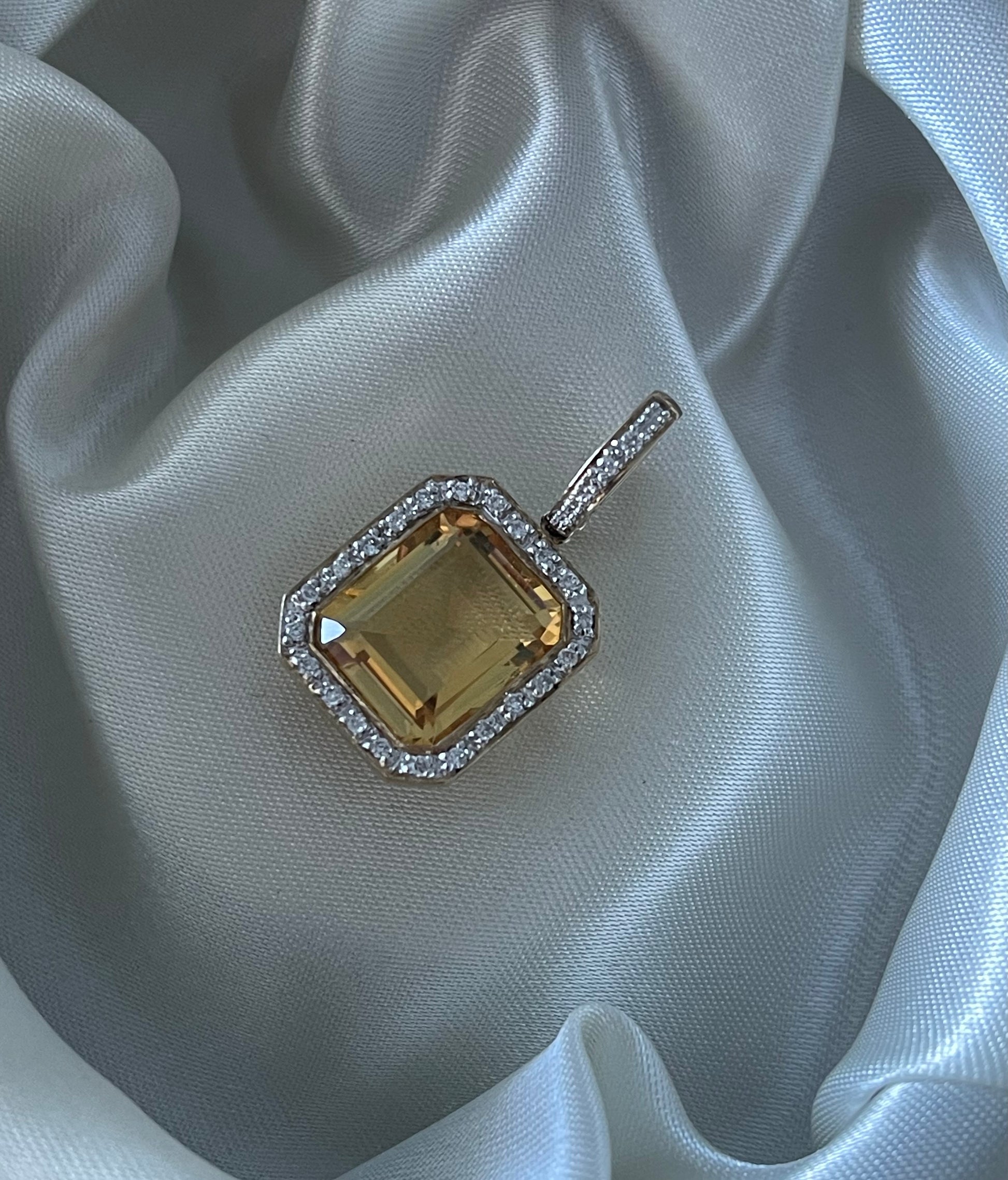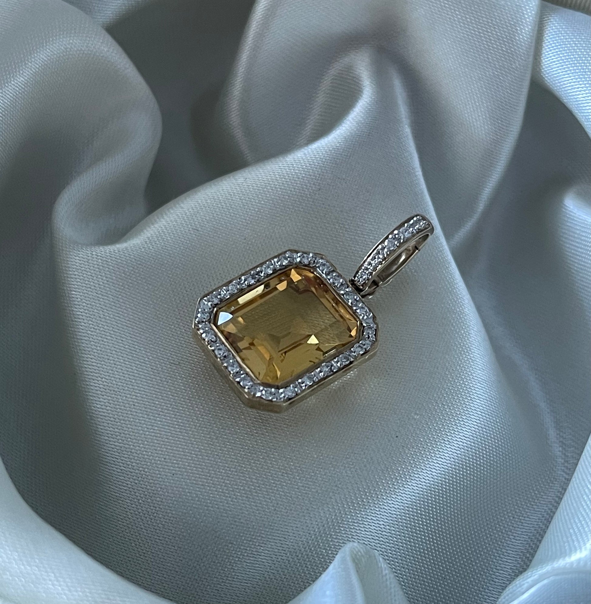 Natural Diamonds – Pave-set halo around the citrine and on the enhancer bail