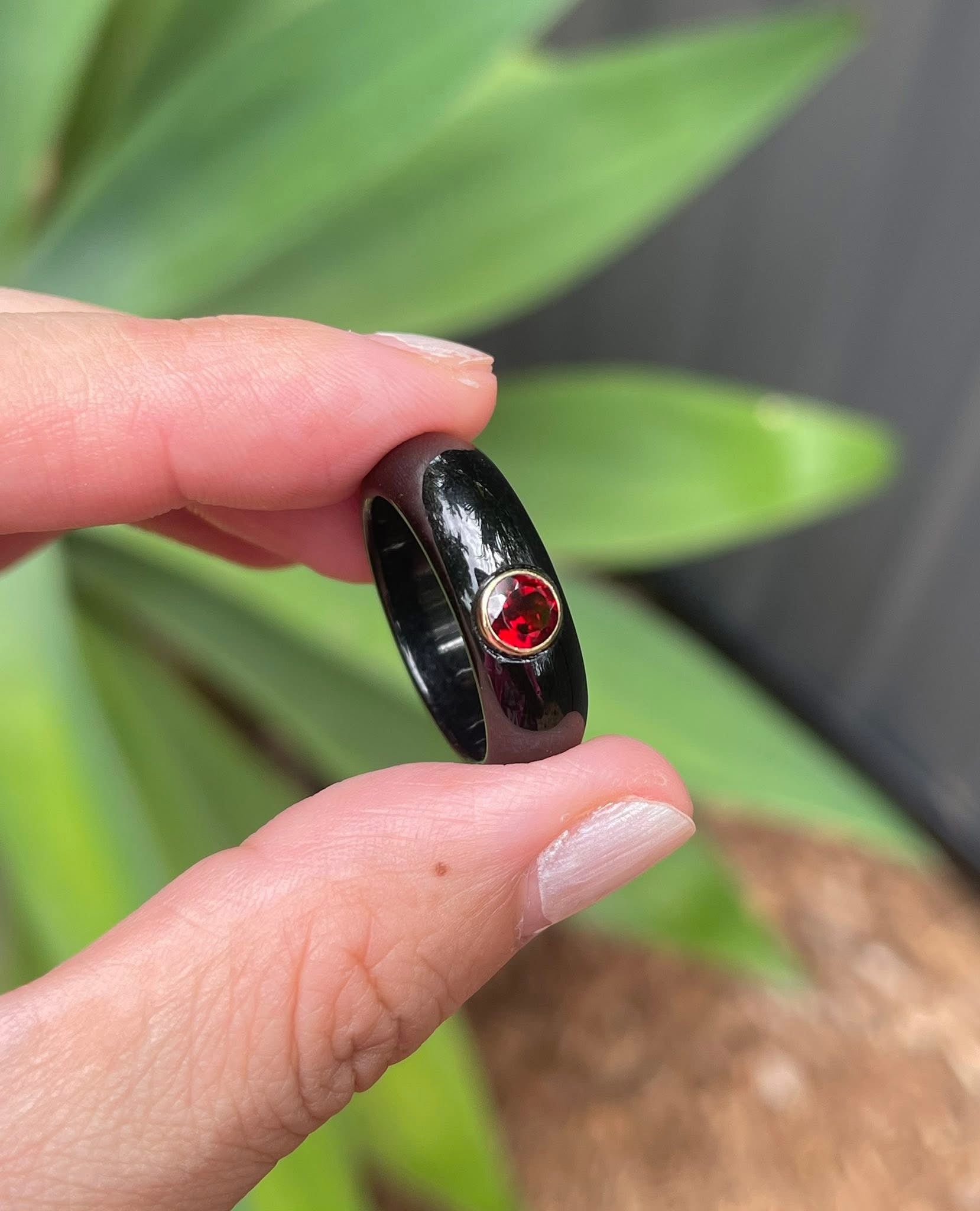 Natural black jade ring with earthy red garnet in 9ct yellow gold