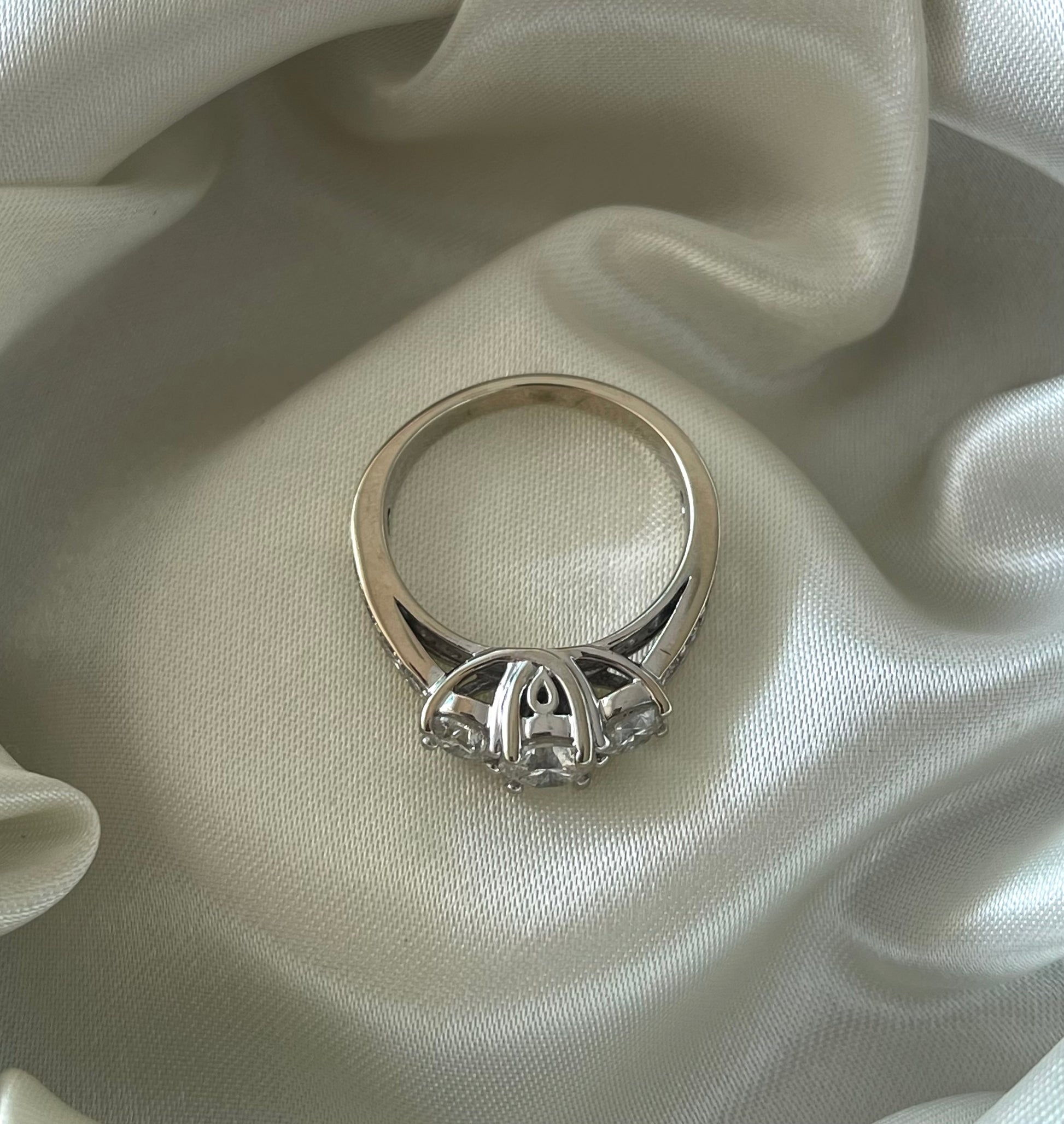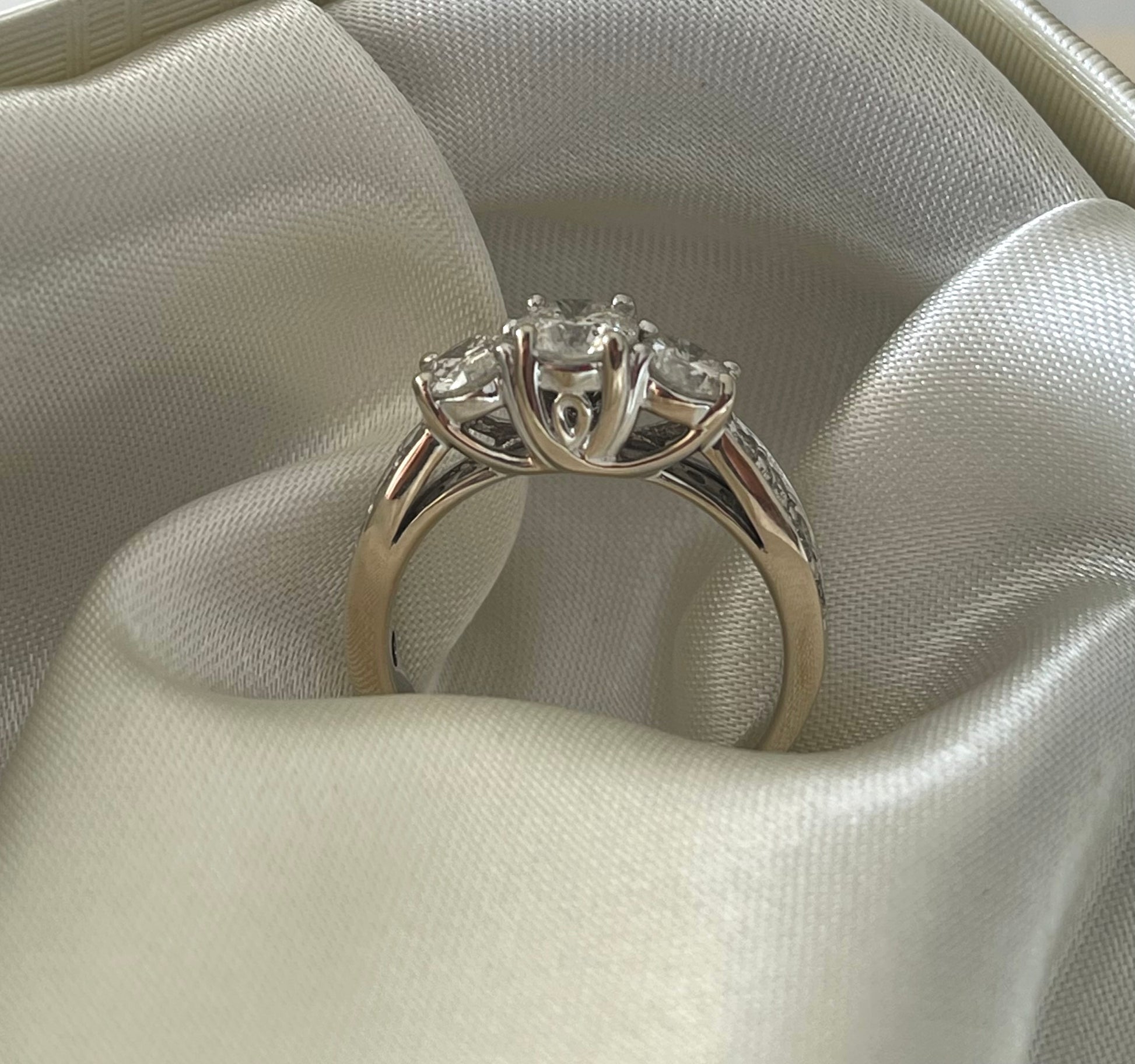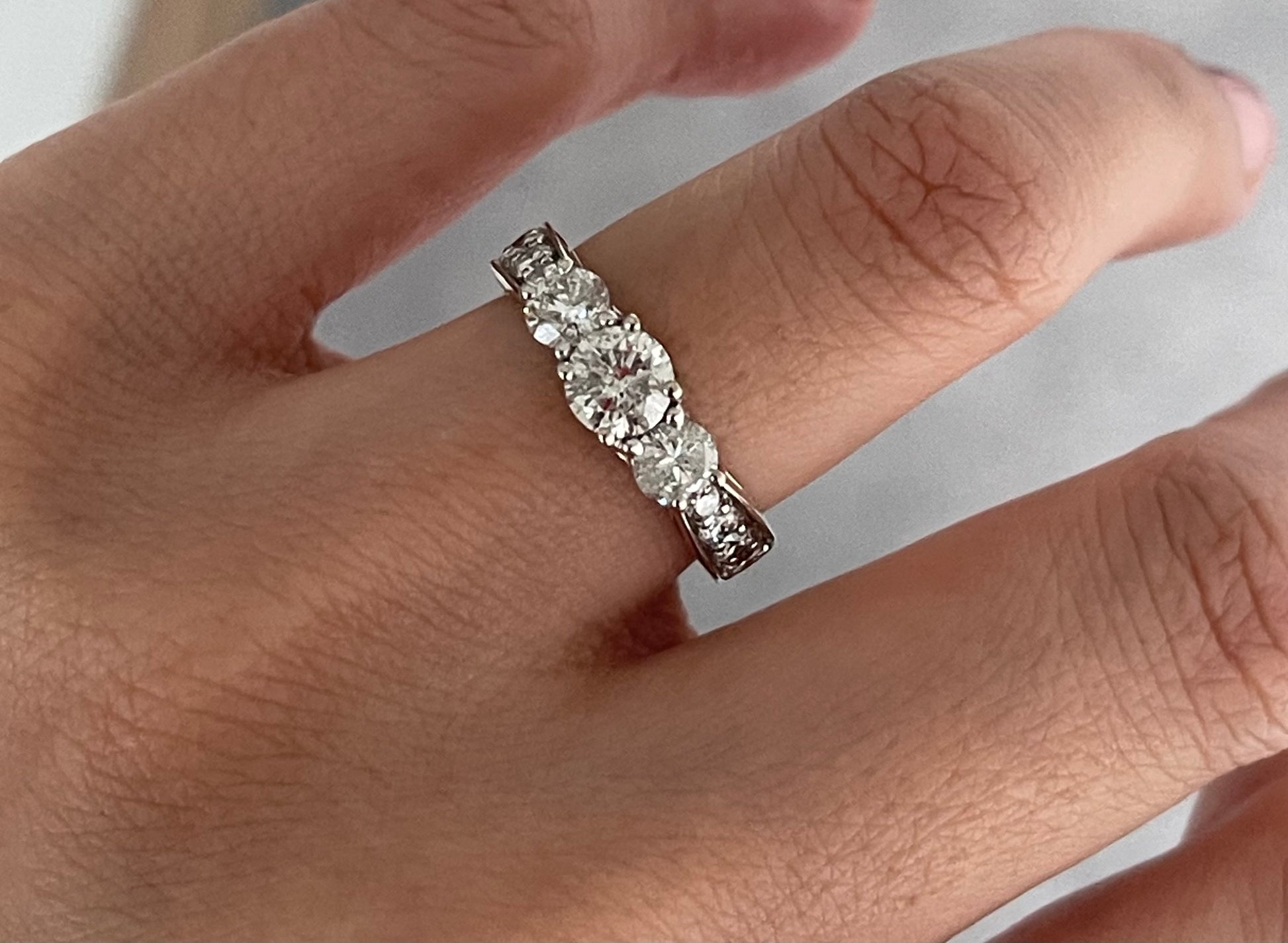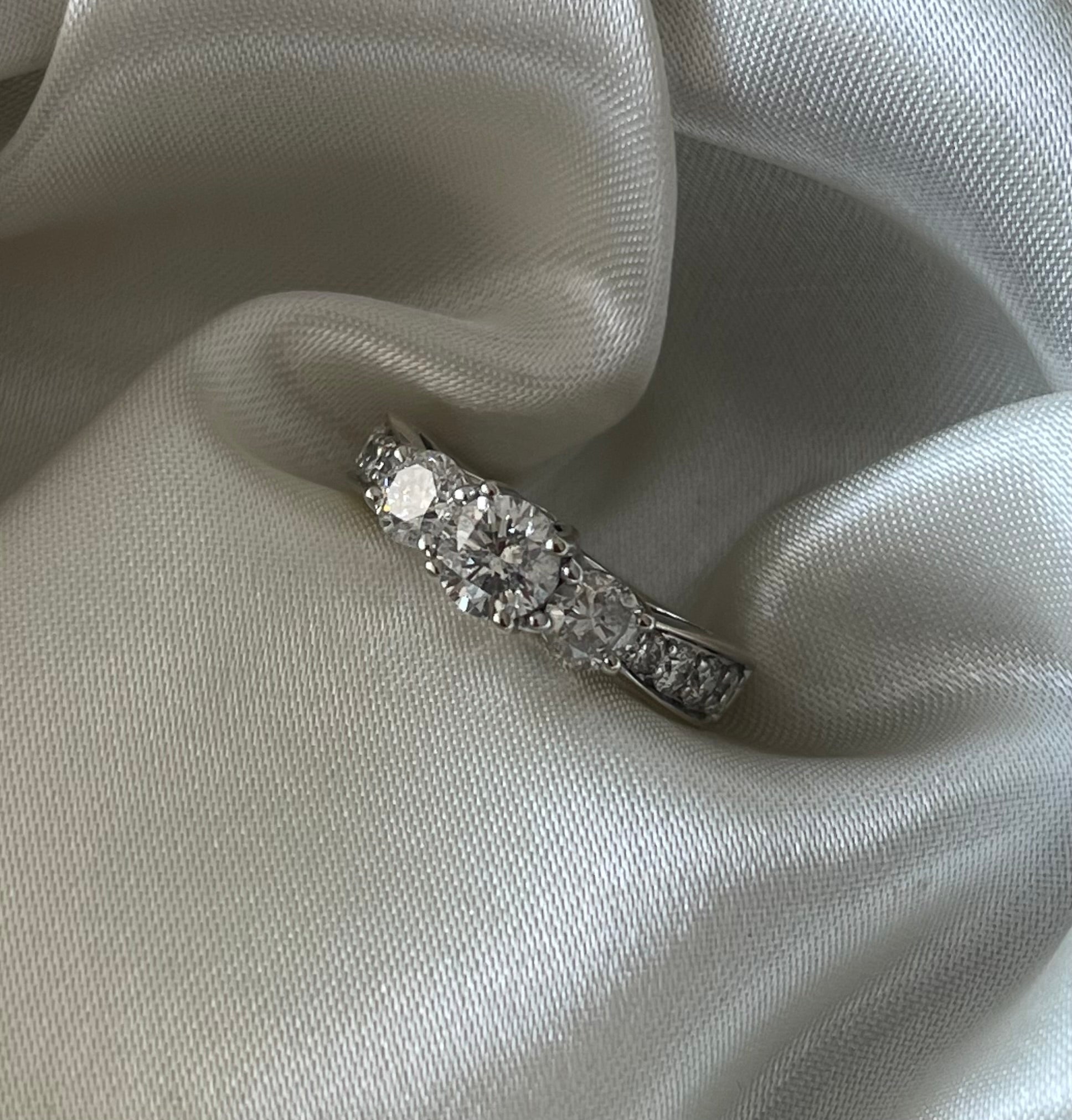 This stunning ring combines classic trilogy styling with extra diamond detailing, making it perfect as an engagement ring, anniversary gift, or special occasion piece