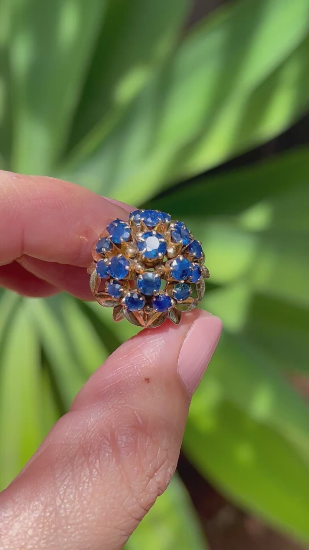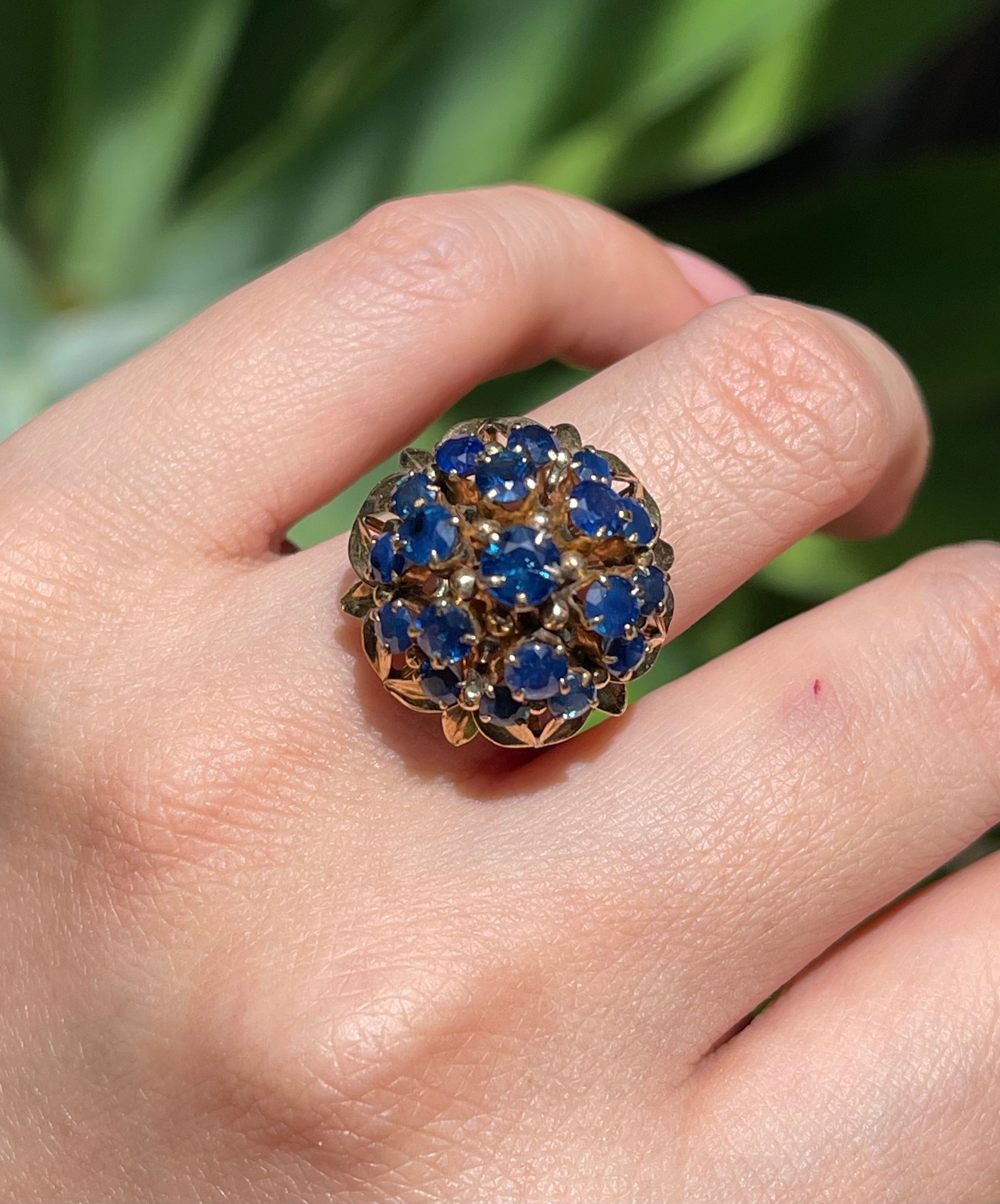 This exquisite vintage cluster ring is crafted in 10ct yellow gold with a total of 19 natural deep blue sapphires in a stunning circular design.