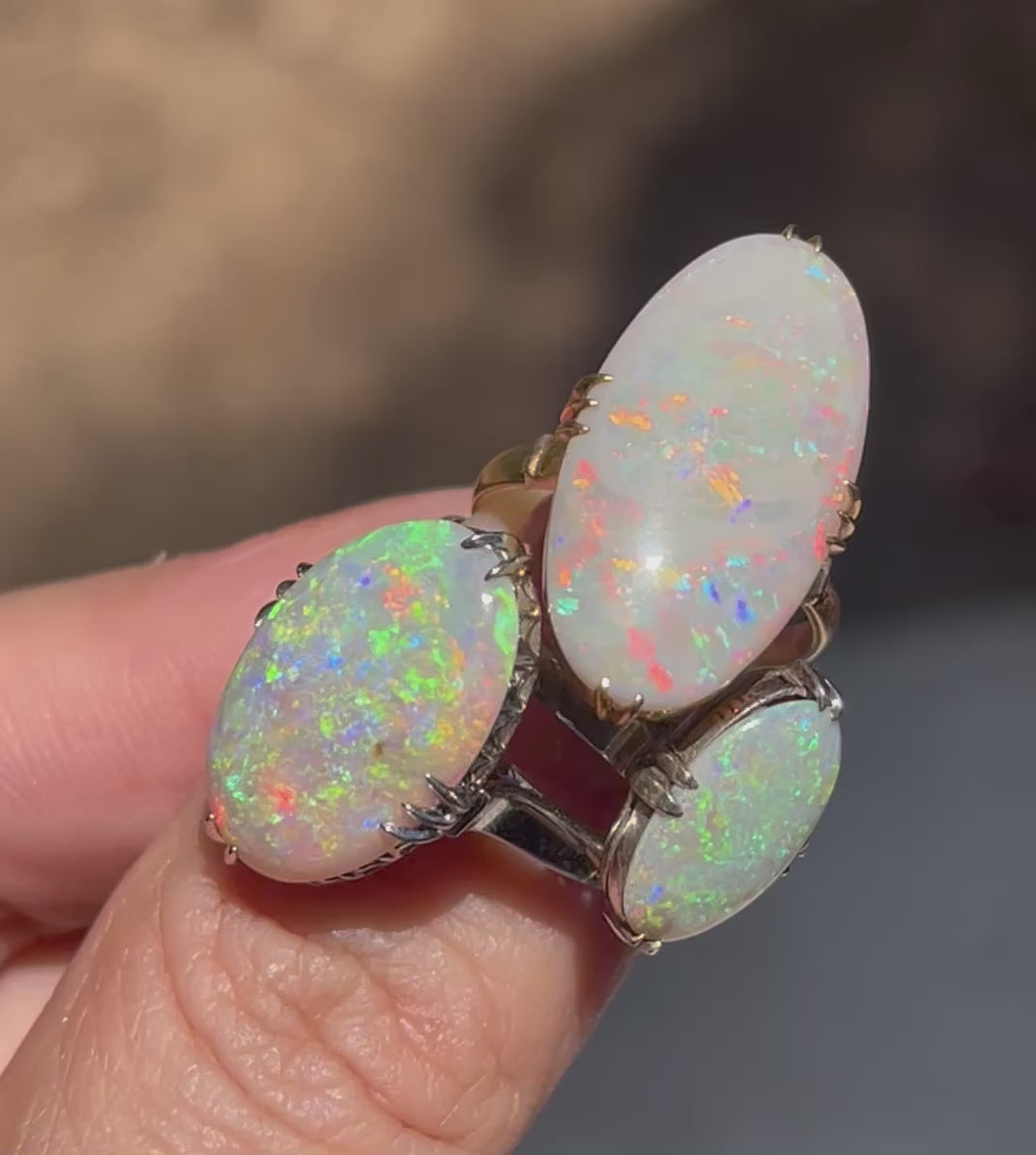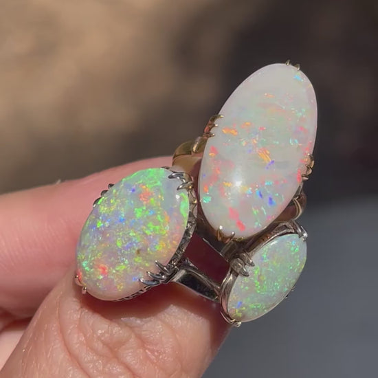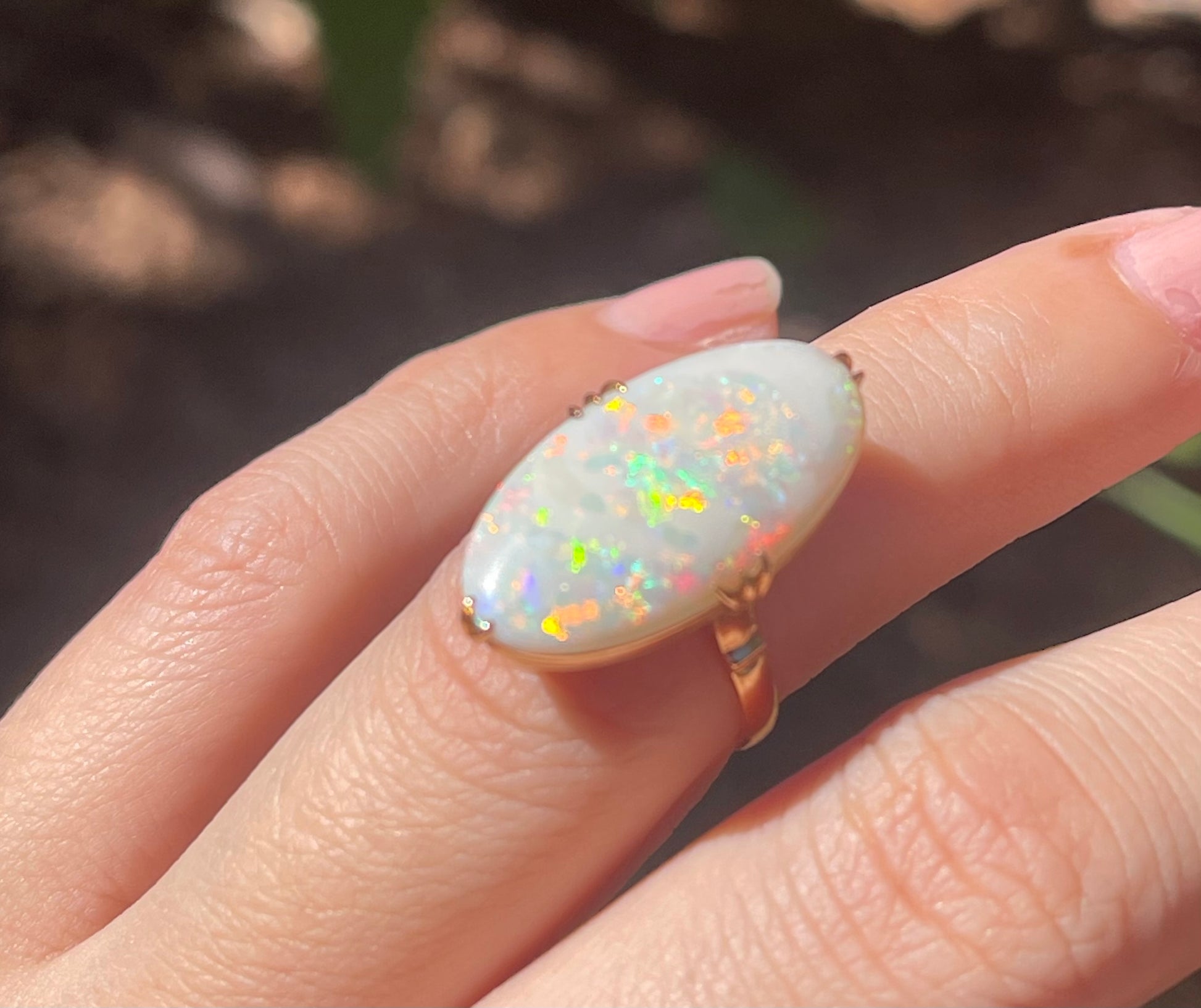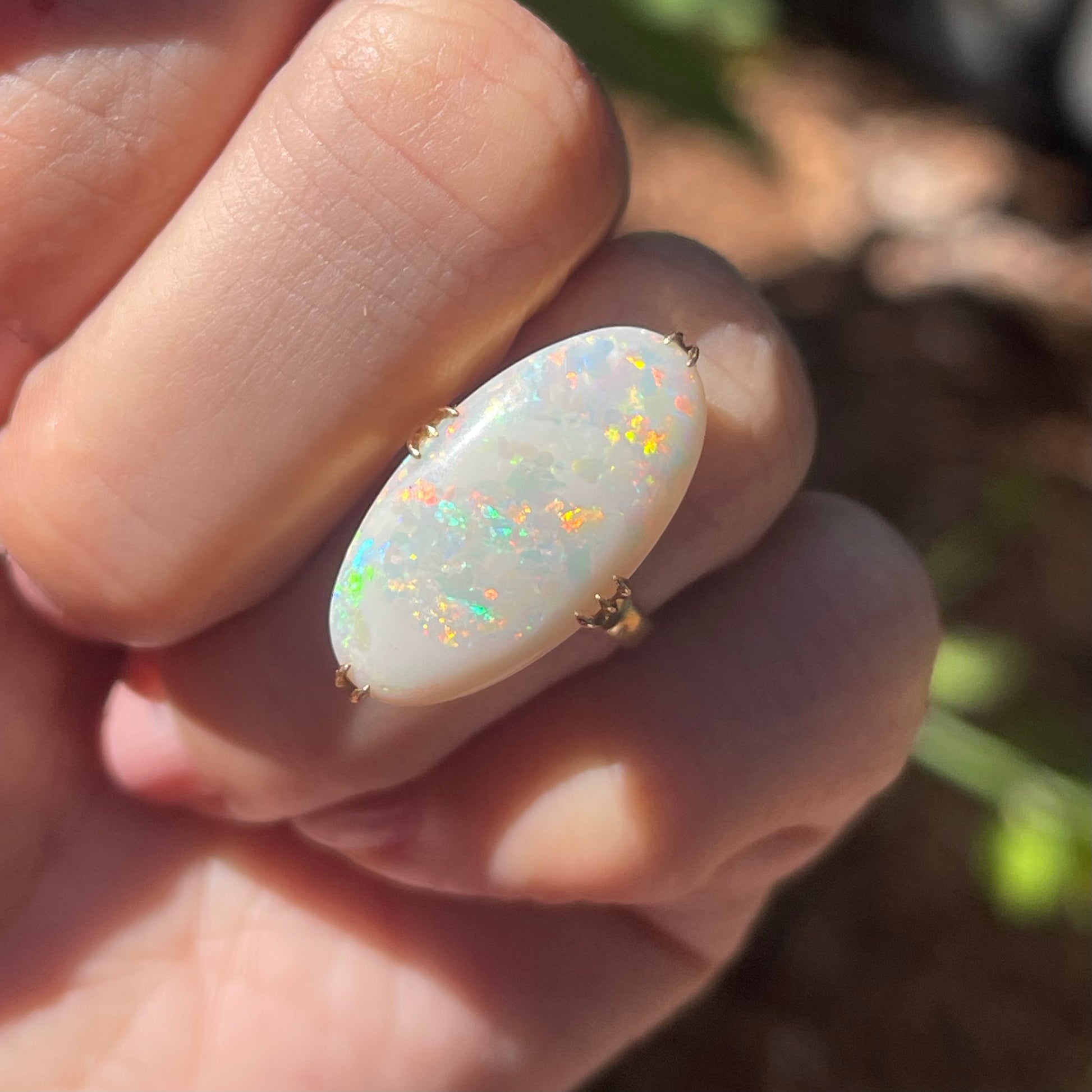 crafted in 18ct yellow gold showing off one phenomenal Australian opal displaying vibrant flashes of neon red, orange, yellow, green, and electric blue across a milky white body.