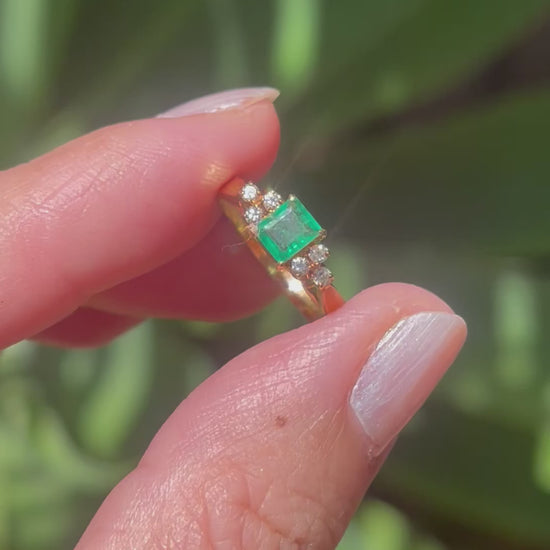 Vintage 90s 18ct yellow gold natural emerald diamond ring